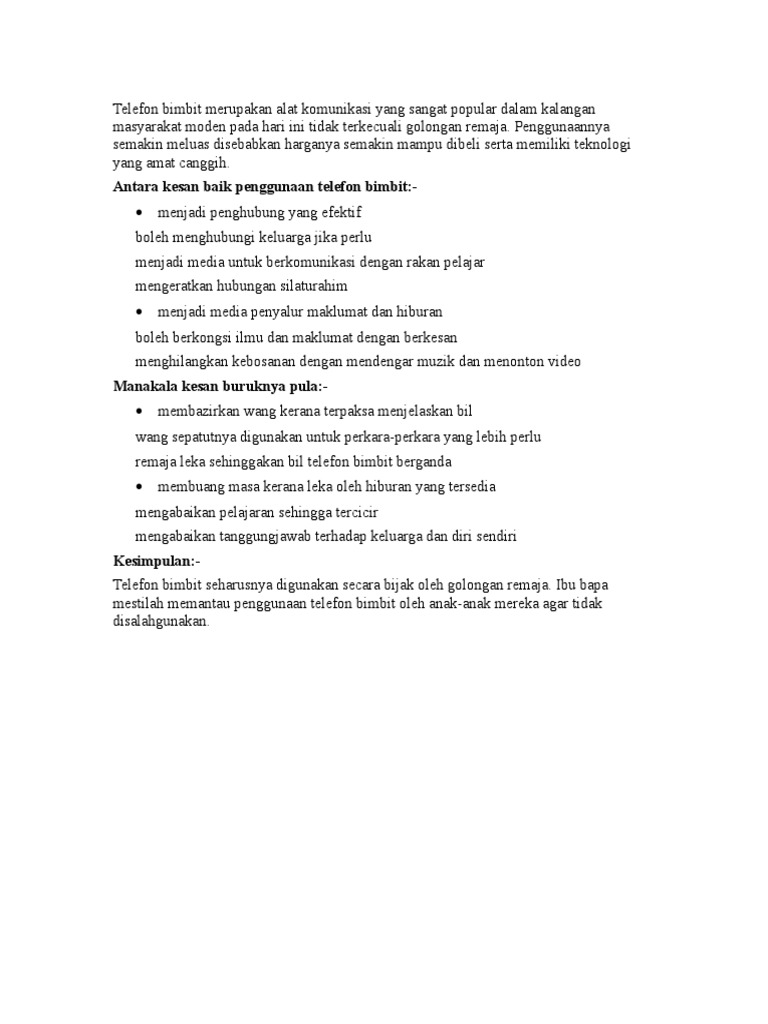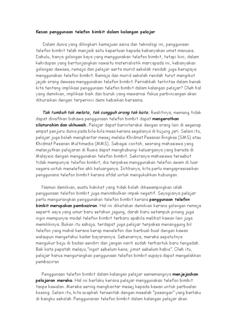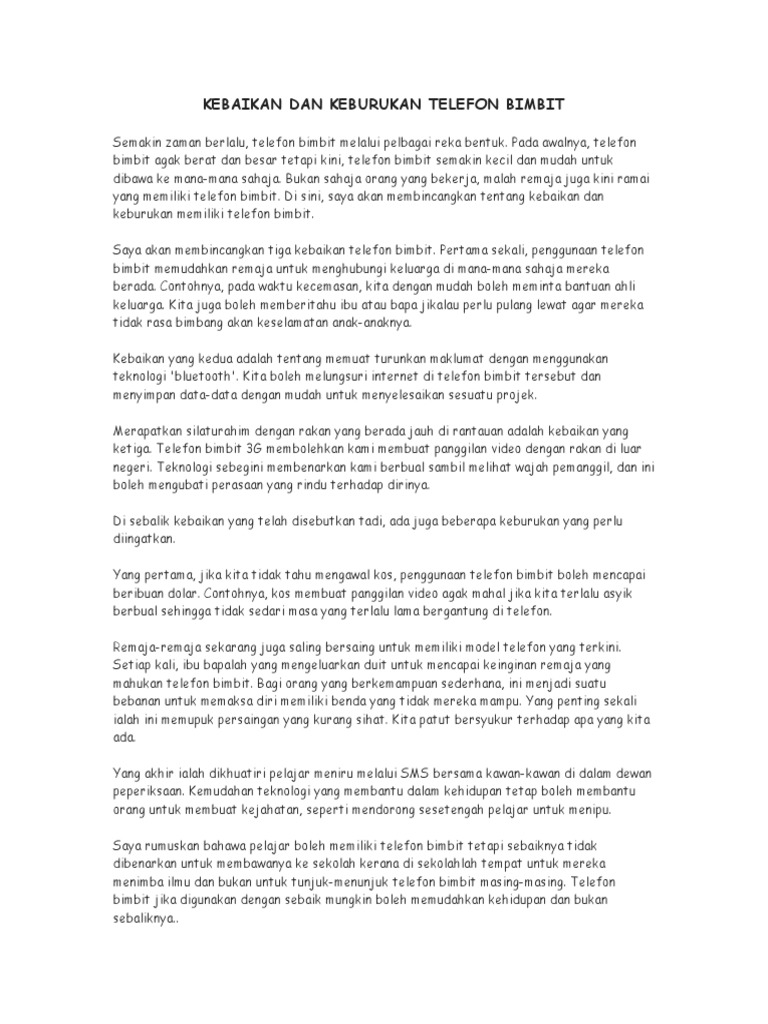 Contoh karangan kesan positif dan negatif penggunaan. Hal ini demikian kerana mereka tidak akan menumpukan perhatian untuk belajar tetapi leka dengan melayari laman sosial seperti. Oleh yang demikian kesan penggunaan telefon bimbit yang dominan terhadap pelajar sekarang akan diketengahkan untuk mencari solusi untuk memperbaiki masalah penggunaan telefon bimbit di kalangan pelajar.